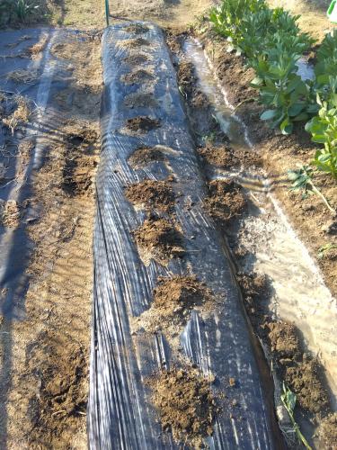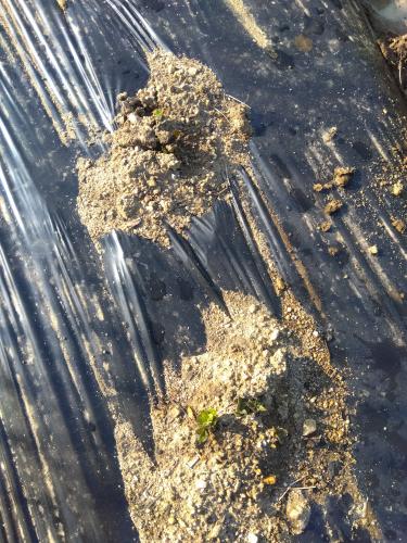 ジャガイモ、発芽を確認しました。全部ではないですが。 本日は最低気温1℃代で霜が降りたようで、昨日発芽したであろうジャガイモは、葉っぱが黒くなっていました。最低気温の予報を見ると、明日からは4℃以上の予報となっており、霜のおそれは無さそうですが、念の為土をかぶせておきました。これで数日は誤魔化すことができるでしょう。 黒くなった葉っぱも、発芽したてだから問題ないと思っています。