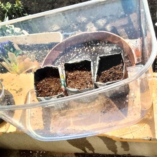 が、白ゴーヤの新聞紙ポットを逆さにしてビニールポットの土の上にバサーっと出したら、いくら探してもタネがどこにもない〜〜