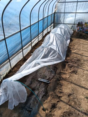ハウスの中に不織布トンネルを設置して植え付け 7mの畝に半分だけ植えました 本当は全部植えたいんだけど深夜時間がまだ寒いですよ 苗に不織布をベタ掛けしたいけど今回はトンネルで 少しでも暖かくして栽培します 深夜の寒さで枯れなければ残りの半分を植付予定 ヒョロ苗なんだけど少し深植でごまかしww
