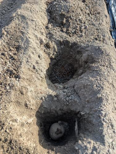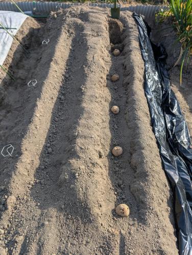植えつけは3月まで 待つつもりだったけど 20度超えの陽気は 早植えのチャンス 芽出し中の種芋が シワシワになってきたので 1月に購入した分だけ先行して 植えつけることにした 前夜雨が降ったけど 黒マルチのおかげで 土の湿り気はちょうど良い 等間隔に種芋を並べて スコップで20センチ位掘った穴に 植えつけ 種芋の間には堆肥と化成肥料と鶏糞 埋め戻して長ぐつで鎮圧し 再度黒マルチで保温と雨よけ
