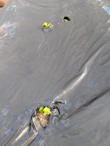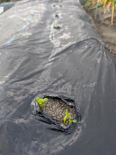 マルチを破って芽を出した