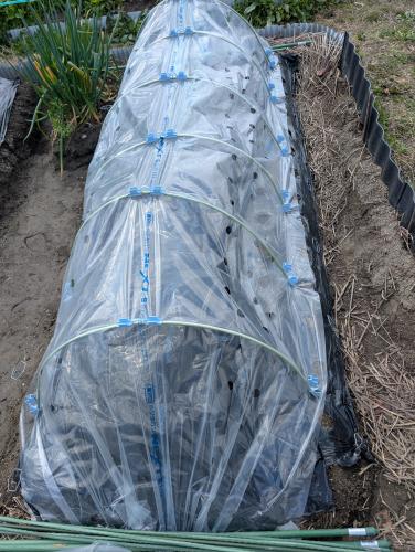 覆土を触ってみると マルチのおかげかほんのり温かく フワフワしているけど乾いている 辛抱たまらず指先で優しくほじるも 発芽している気配なし このままでは本当に蒔き直しかも ジョウロでほどほどに湿らせて さらなる保温にU字支柱を立て 穴あきビニールトンネルを追加設置