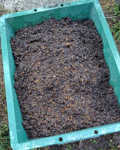 今日は晴れ予報なので 人参用の土をコンテナにうつして日光消毒した。