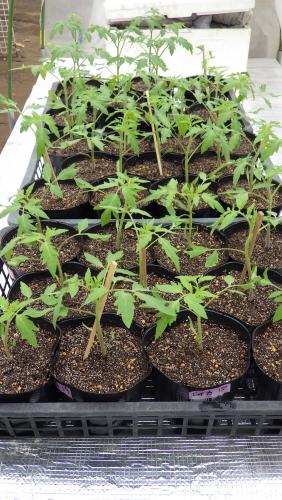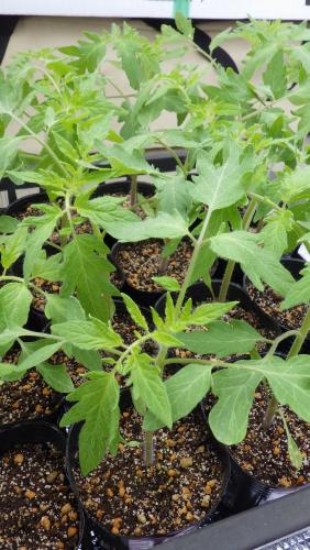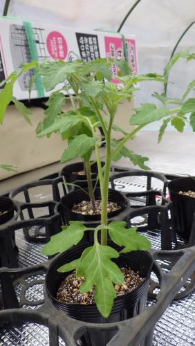 ミニトマト「ロイヤルパッション」は本葉8枚になり、蕾が確認できるようになりました。90mmポットでは窮屈なので135mmポットに鉢替えです。麗夏は本葉7枚ですが同時に作業してしまいました。