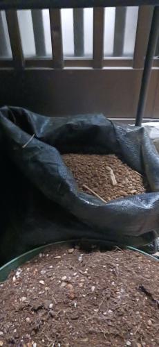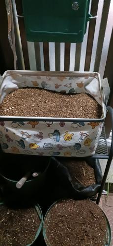 YouTubeで見た袋横向き栽培したくて土嚢袋買ったら小さくて横向きもどきバックで。 欲張って7個位植えました。 男爵しか売ってなかったです