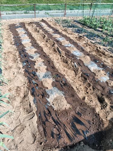 今回は耕耘を2回しました スコップで下の方も耕耘したので 又割れの様な大根はできない予定です ただし予定は未定です 黒マルチ 9215 古いお古×3のマルチを 使いました 穴は1個飛ばしです株間の30cm 種は3粒蒔きで発芽待ち