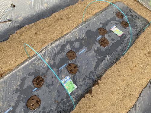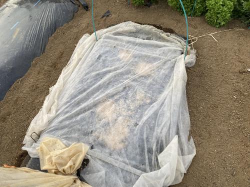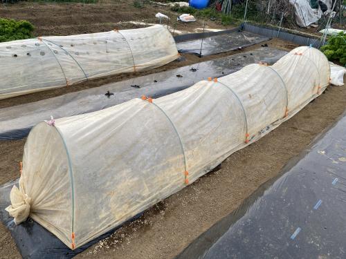 取り急ぎ、「おつな姫」・「うまい茶豆」、播種です。 二ビトン長さ足りず、「うまい茶豆」は不織布かけした。
