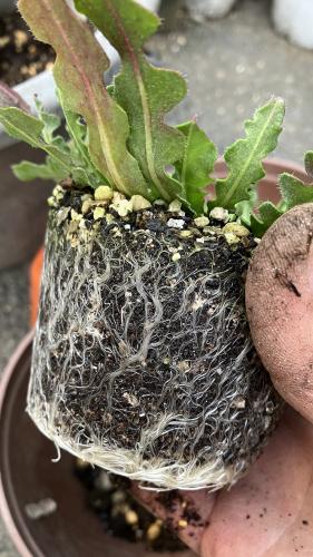 用土はよくある培養土、再生土、鹿沼土が各三割、残りは堆肥。水はけをよくするのがこいつも大切とかで、鉢底に小石を置いた。また、中性から弱アルカリ性の土が良いそうなので、有機石灰(貝殻を小さくしたようなやつ。だからすぐには効かないだろう)も足した。ビニルポツトから出してみると細い根がたくさん回っていた。こういうタイプは土をほぐすと回復までにかなりかかるので、今回はそのまま植えた。現在は、ロゼット形の葉っぱの出方なので土を入れるとき、葉の上にかなり乗っかって苦労した。中腰でこの手の作業をするのは良くない。