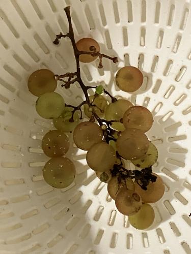 ほぼ終わりになってきた収穫時期。これもデラウエアらしく、かなり糖度が高い。最近は大粒の種類に人気があるが、味で言えばやはりデラウエアは信頼できる。期待を外さない。 それにしても、今年はアライグマにだいぶやられた。箱罠内の餌には最近は見向きもしないのか。