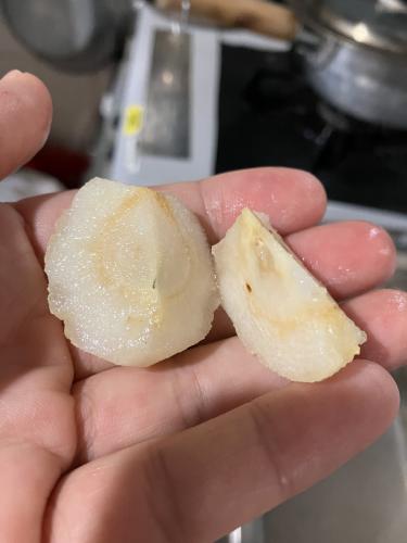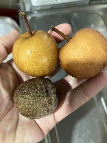 実生のミニミニ豊水。また落果。これで三つめだ。味は今回のはなかなか良い。確かに味はやや薄めだが、歯触りや色などは販売されてるものと変わらず、悪くない。